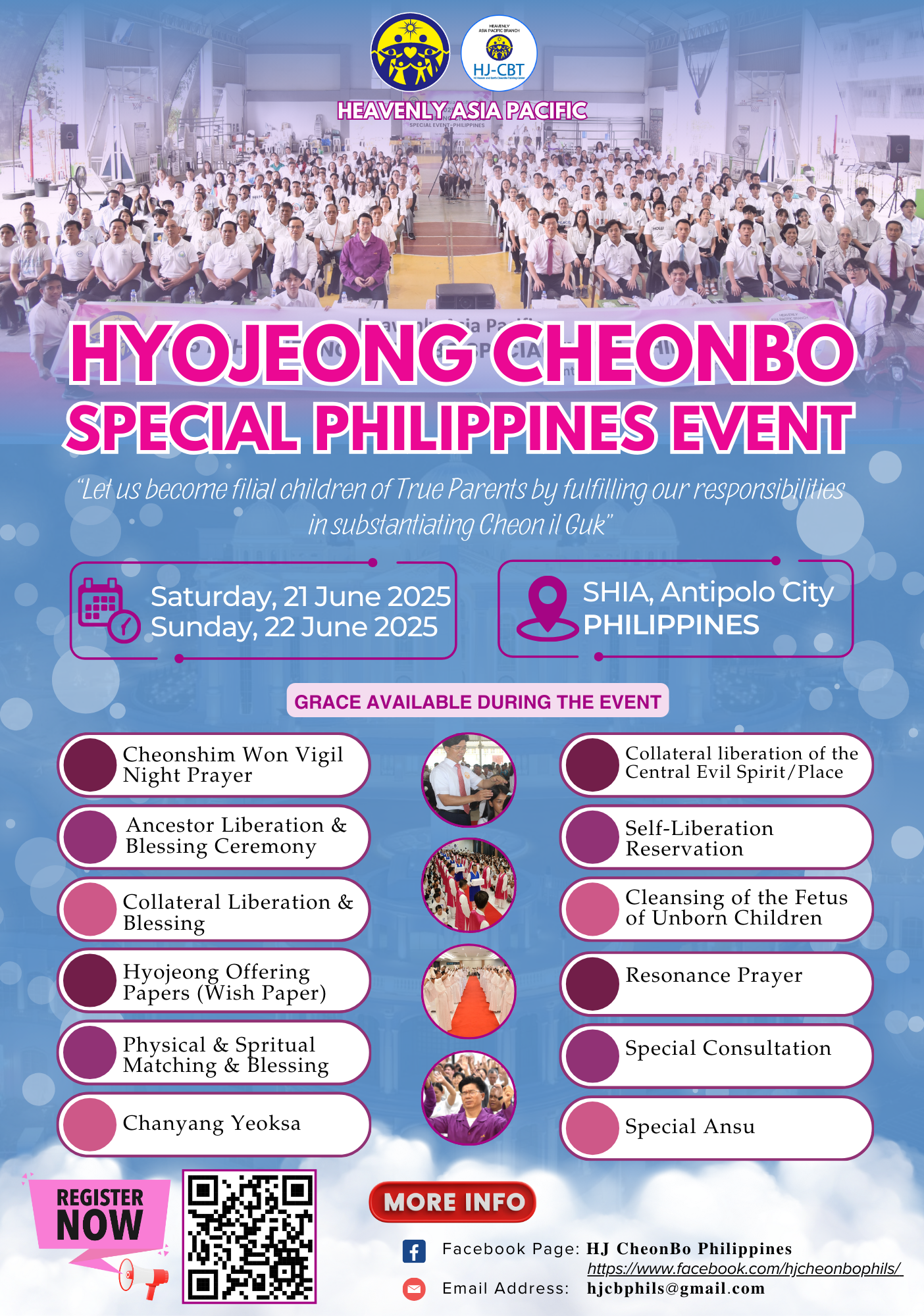 This transformative event will include: Vigil Prayers: Strengthen your spiritual discipline through heartfelt prayer. Lectures and Q&A Sessions: Gain deeper insights into Unification spirituality. Chanyang Yeoksa: Participate in uplifting sessions to purify the mind and soul. Resonance Prayer Practice: Develop a deeper connection to Heavenly Parent and True Parents. Ancestor Liberation and Blessing: A profound opportunity to honor and uplift ...
